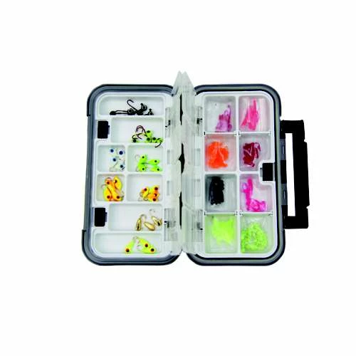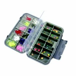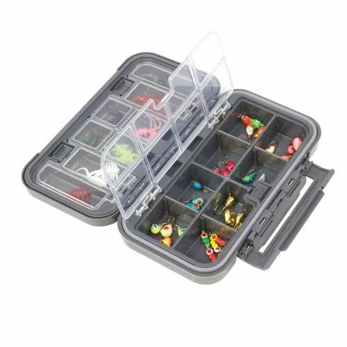 - Two-sided jig box to store jigs, spoons, plastics, and other larger baits